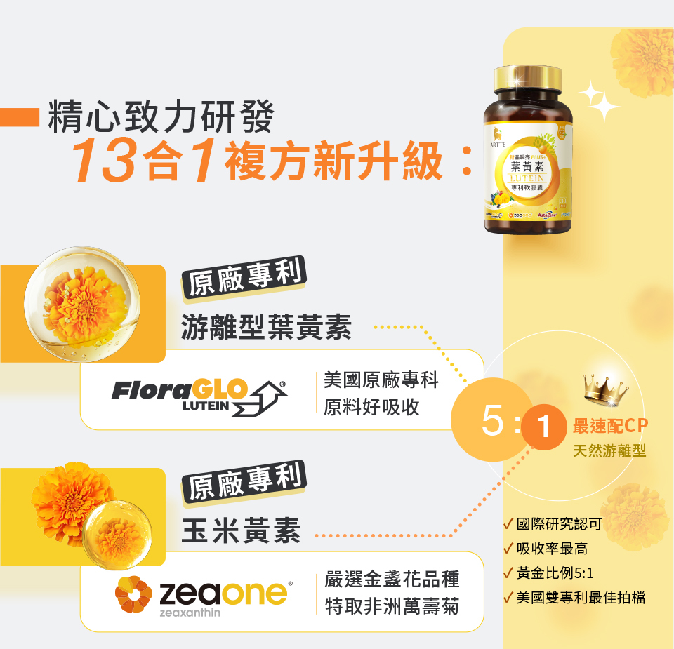🌟嚴選美國雙專利 FloraGLO® 葉黃素+ZeaONE® 玉米黃素 5:1 黃金比例
